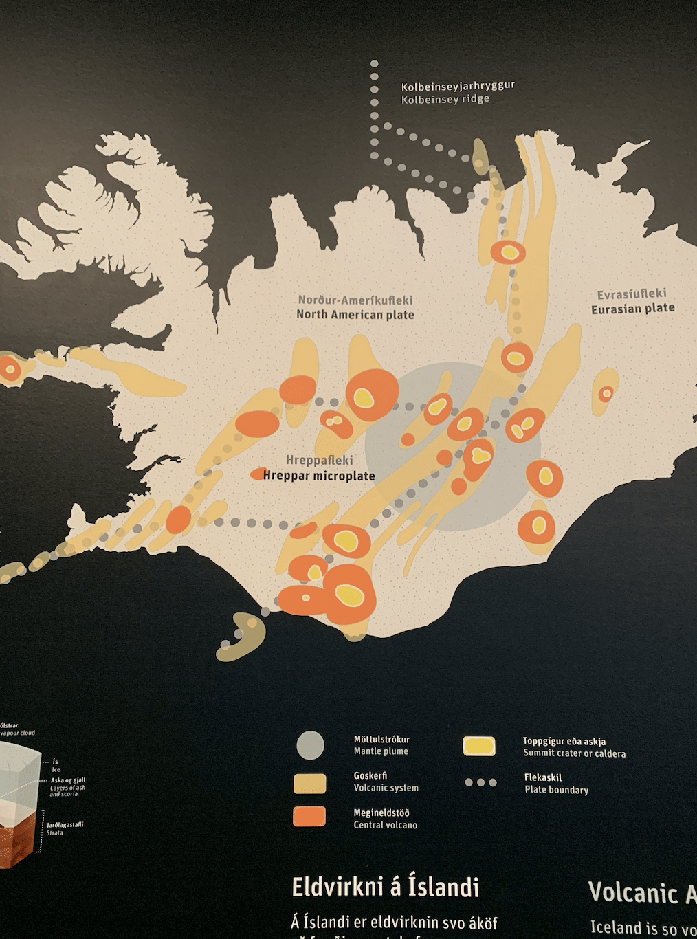 Start your tour with a stroll along the 360° viewing platform that houses an impressive collection of local volcanic and volcaniclastic rocks. Next we will move into the warm glass domed cafe on the top floor of the museum, where we will look at maps, photographs, and charts, detailing Iceland's geology. We can even stop for a kaffi and sörur too. We will finish the tour walking through the geology section of this museum, and finish right on time for you to hop into the next showing of the volcano eruption movie.